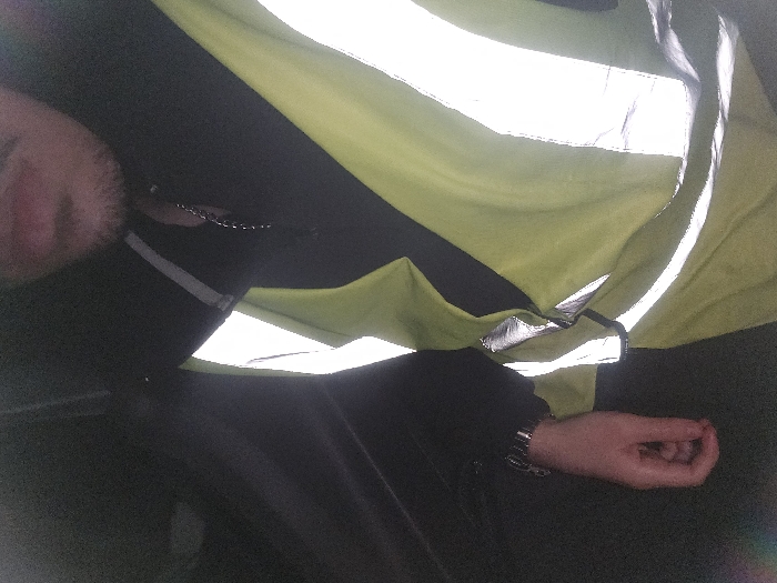 An individual is depicted from the mid-chest upwards, positioned within a dimly lit, confined space, possibly a vehicle interior, in Guildford, United Kingdom. The subject, a male, exhibits stubble on his chin and wears a dark-colored long-sleeved top overlaid with a fluorescent yellow high-visibility vest featuring prominent silver reflective strips. A dark watch with a metal band is visible on his left wrist, and a thin chain necklace hangs from his neck. Strong external illumination, likely sunlight, creates significant glare on the reflective strips and brightens the vest material on the right side of the frame. The subject's right hand hangs loosely towards the bottom left, and a subtle lens flare is present in the lower left corner.