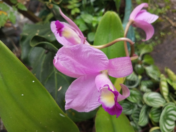 A macro photograph depicts three blooming orchids amidst dense foliage in the city of Benshingmo_Jomtsang, Bhutan. The central orchid, prominently featured, exhibits light purple-pink petals and a distinctive labellum that transitions from a yellowish-white base to a deep magenta tip. A second orchid is partially visible behind and to the upper left of the central flower, displaying similar coloration. A third, less defined orchid is located in the upper right quadrant of the image. The orchids are supported by slender, brownish-green stems. Large, ovate, dark green leaves are present in the foreground and midground, while smaller, patterned green leaves, likely of a *Peperomia* species, occupy the lower right. The background consists of blurred green vegetation and indistinct darker surfaces, indicating a natural or cultivated outdoor environment. No human subjects or human-made objects are discernibly present.