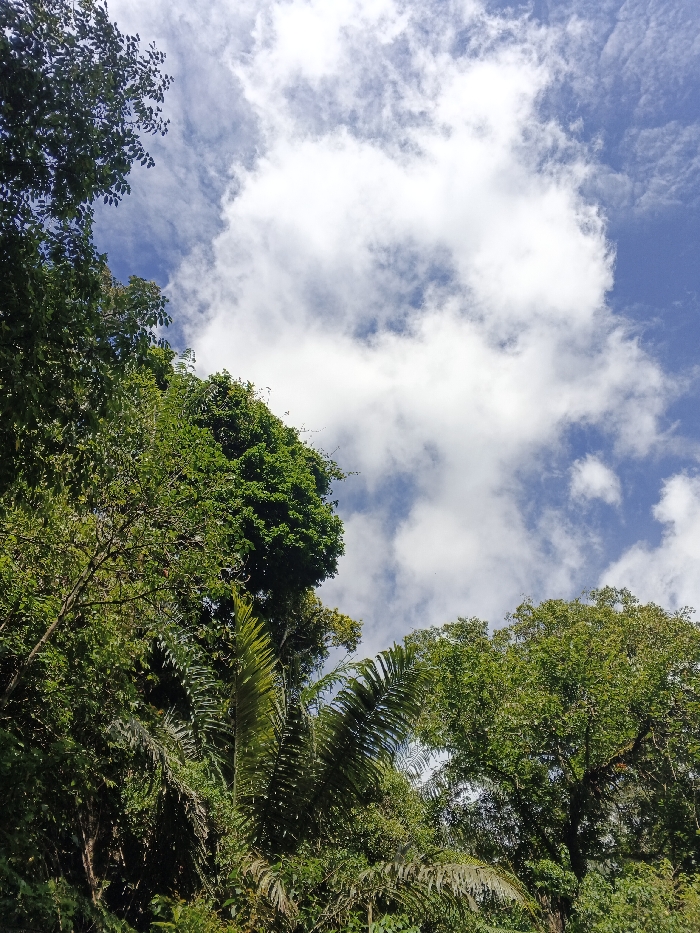 Lush greenery dominates the lower half, featuring various trees and plants. A prominent palm tree with long, pointed fronds adds to the dense vegetation. The upper half displays a vibrant blue sky filled with puffy, white clouds. The sunlight creates a bright, airy atmosphere, highlighting the details of both the foliage and the clouds.