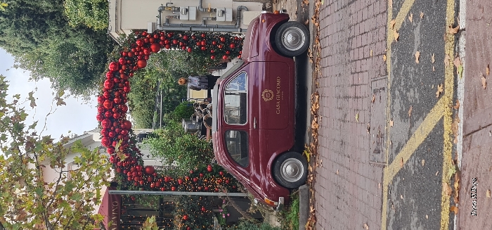 An outdoor scene in Kifisia, Greece, depicts a maroon vintage Fiat 500, likely a 500 F/L/R model, parked curbside on a street. The vehicle's passenger side is visible, featuring a golden "CASA GIACOMO" logo and an open fabric sunroof. The street surface is asphalt, marked with a double yellow painted line, and partially covered with scattered dry autumn leaves. The adjacent sidewalk is constructed from reddish-brown rectangular paving stones, also strewn with dry leaves, and contains a square metal utility cover. Behind the parked Fiat, a building entrance is framed by a prominent archway densely decorated with numerous red spherical ornaments and integrated white string lights. Lush green bushes, similarly adorned with smaller red ornaments, flank the archway. To the immediate left, a red awning displaying the partial text "VINO" is visible. To the right, multiple grey utility boxes and exposed pipes are mounted on the building's light-colored facade. A single individual is observed from behind near the decorated entrance, wearing dark clothing and a light-colored backpack. The background features deciduous trees with a mix of green and browning leaves, along with taller evergreen trees, all beneath an overcast sky.