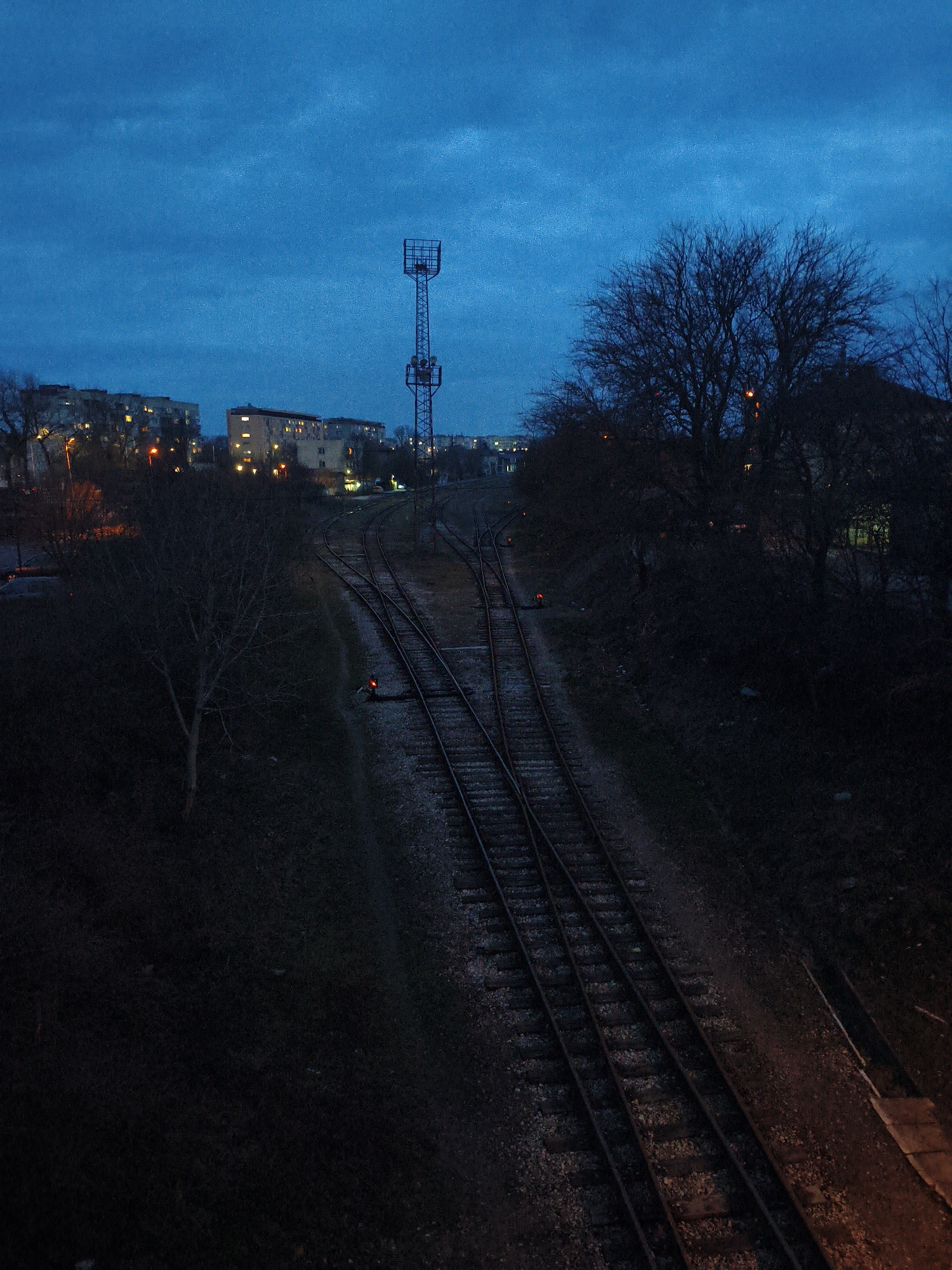 The scene depicts an urban railway environment in Dobrich, Bulgaria, observed at dusk or nighttime under a deep blue sky with visible cloud cover. The primary subjects are multiple railroad tracks, bare trees, and distant urban structures. In the midground, a set of at least four parallel railway tracks with gravel ballast runs diagonally from the upper left towards the lower right. Several track switches are visible, indicating a junction or shunting area. A small, red signal light is illuminated near the tracks on the left side, and another fainter red light appears further down the tracks on the right. The left side of the image features a dark, grassy embankment and a prominent bare deciduous tree with visible branches. To the far left, indistinct artificial lighting suggests a street or other urban development. On the right side of the tracks, dense, dark foliage and several bare trees obscure the view. Through these trees, parts of a building with an illuminated window can be seen. In the lower right corner, a section of concrete or pavement receives an orange glow from an unseen light source. In the background, a cluster of multi-story buildings, likely residential, display numerous illuminated windows. Streetlights are visible as small, orange points of light throughout the background urban area. Dominating the background skyline, slightly right of center, is a tall, dark lattice-structured tower, possibly a communication mast or lighting fixture, featuring two distinct platforms. No individuals or active vehicles are discernible within the frame.