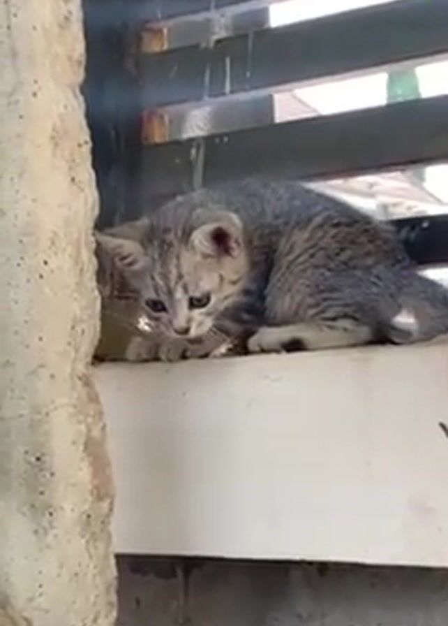 small gray tabby kitten sitting on a ledge of a concrete structure, beneath a slatted barrier