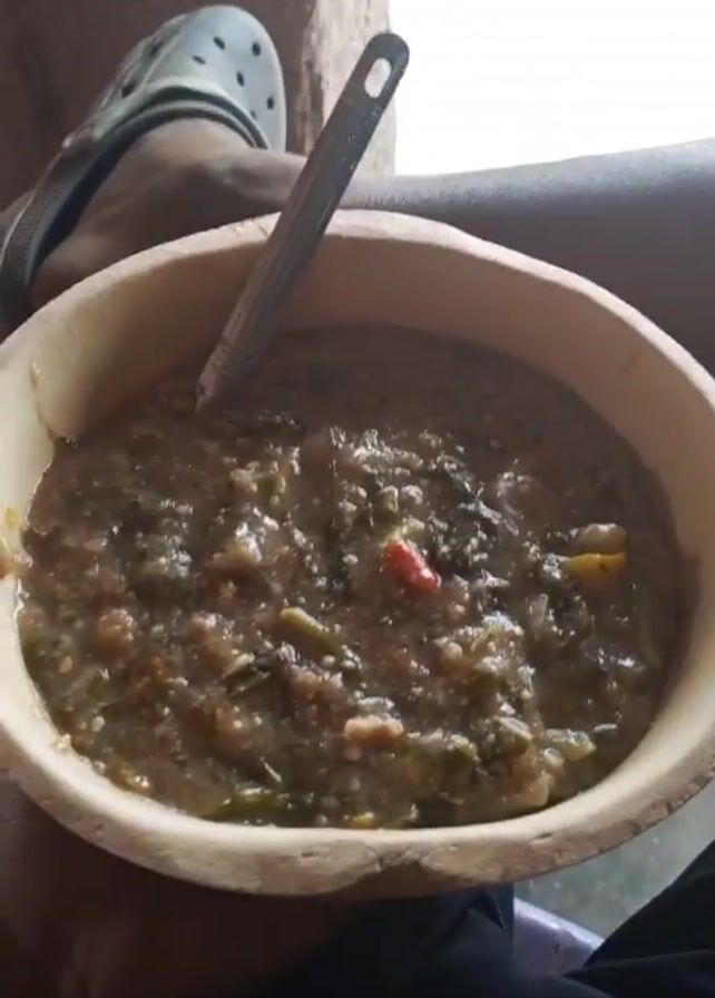 A person sits while holding a bowl of tribal food. The food is described as a "call it." It's a vegetable soup. A spoon is stuck in the middle of the bowl. The person wears a blue sandal on their left foot and black pants.