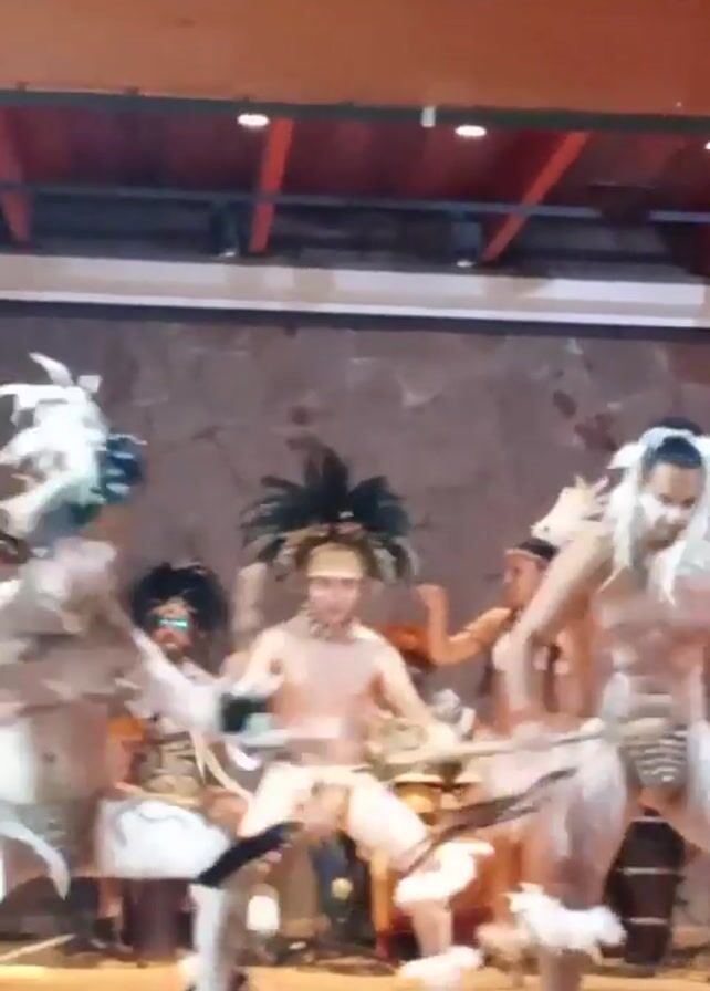 On a wooden stage, a group of performers, some male and some female, perform a tribal dance. The dancers are adorned in partial, tribal costumes with feathered headdresses, skirts made of natural materials, and body paint. They perform intricate steps, some holding short sticks, their movements rhythmic and energetic. Behind them, a stone-like wall provides a backdrop, and above, the ceiling is lit by recessed lighting, revealing a grid of wooden beams.