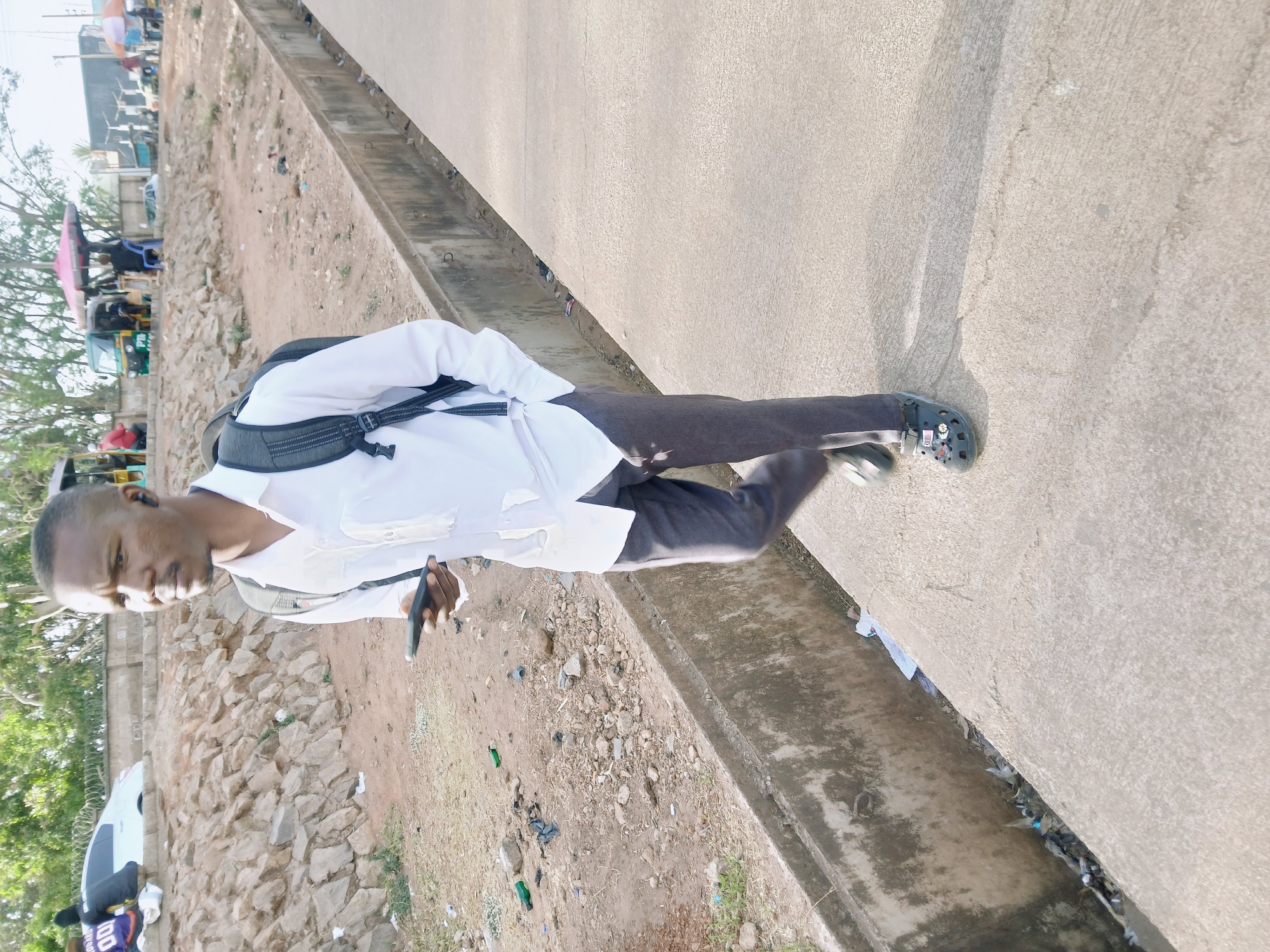 An adult male with dark complexion and short, dark hair walks along a textured concrete sidewalk in Kang, Botswana. He is dressed in a white collared, long-sleeved shirt, dark grey trousers, and dark grey Crocs adorned with decorative pins. A dark grey backpack is worn over his shoulders. He has a black earbud in his right ear and holds a dark smartphone in his left hand, while his right hand rests in his pocket. He is captured mid-stride, looking towards the right of the frame. Adjacent to the sidewalk, a concrete drainage ditch runs parallel, containing visible litter including plastic and paper debris. Beyond the ditch is an unpaved, uneven dirt embankment interspersed with rocks, sparse dry vegetation, and scattered refuse such as plastic bags and green glass bottles. In the background, positioned atop the embankment, a higher ground level or street is visible. Several individuals are present; one person, observed from behind, sits on a low wall, wearing a black top and a purple sports jersey with "BOTSWANA 00" visible. A white sedan is parked behind this individual. Further down the street, multiple motorized rickshaws (tuk-tuks) are parked, some positioned beneath small, colorful market umbrellas (red, orange, green). Trees with green foliage line the distant background under a bright, clear sky.