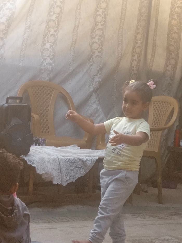 - "The image depicts an indoor or covered outdoor scene in Al-Mawasi, Unknown, featuring two young children and various household objects against a patterned fabric background" by FM-cV3b62, licensed under CC BY 4.0