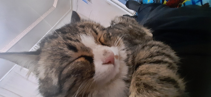 - "A domestic short-haired tabby cat, displaying brown, black, and white fur patterns, is depicted asleep in a close-up, high-angle shot" by FM-0zE9q2, licensed under CC BY 4.0