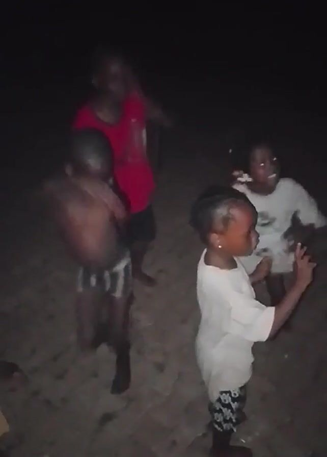 five children, likely around 3-8 years old, in an outdoor setting at night. Due to the low lighting, the details are somewhat blurry, but it appears they are dancing. One child is shirtless, wearing patterned shorts. Two others are wearing white shirts and patterned bottoms. One is in a red shirt and dark shorts. The fifth child's attire is hard to discern. They seem to be enjoying themselves, moving to music, though the source of the music is not visible. The ground is a light color, suggesting sand or dirt.