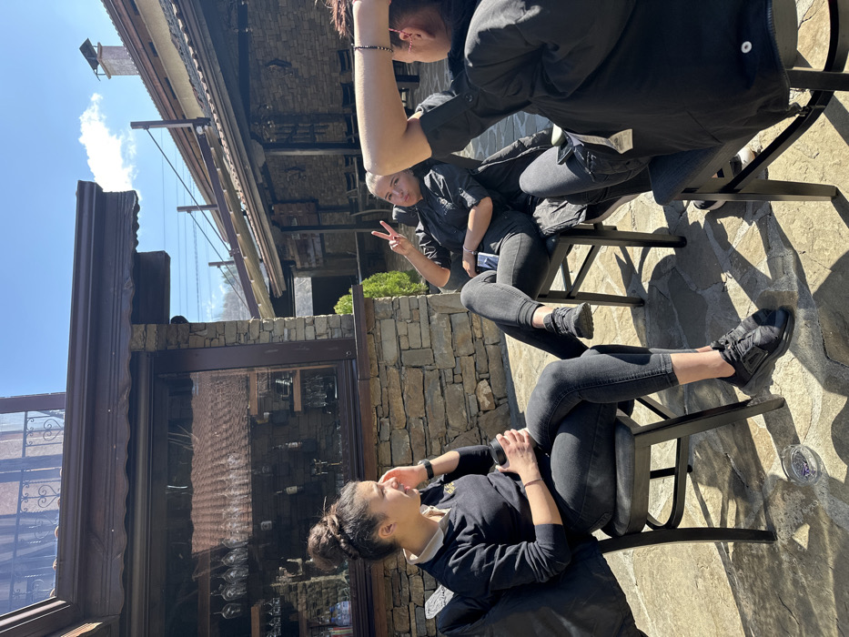 The image displays an outdoor patio scene in Oreshak, Bulgaria, under bright sunlight, evidenced by distinct shadows on the stone-slab ground. Three females are seated in dark chairs. On the left, a female with dark hair tied in a bun wears a dark V-neck top over a light-collared shirt, dark jeans, and black sneakers, holding a black cup while looking towards the left side of the frame. A clear glass ashtray with purple contents rests on the ground near her feet. In the center, a blonde-haired female, wearing a dark short-sleeved shirt, dark jeans, and dark sneakers, faces the viewer, making a peace sign with both hands. A dark jacket is draped over the back of her chair. On the right, partially visible from the back, a third female with dark hair is seated, wearing a dark jacket and dark pants, with her hands clasped behind her head. The background features stone-clad building facades. Immediately behind the left female is a section with a large window displaying a bar setup with hanging glasses and bottles. Further back, a building with a tiled roof, chimney, and a retracted awning system is visible. Scattered greenery is also present.