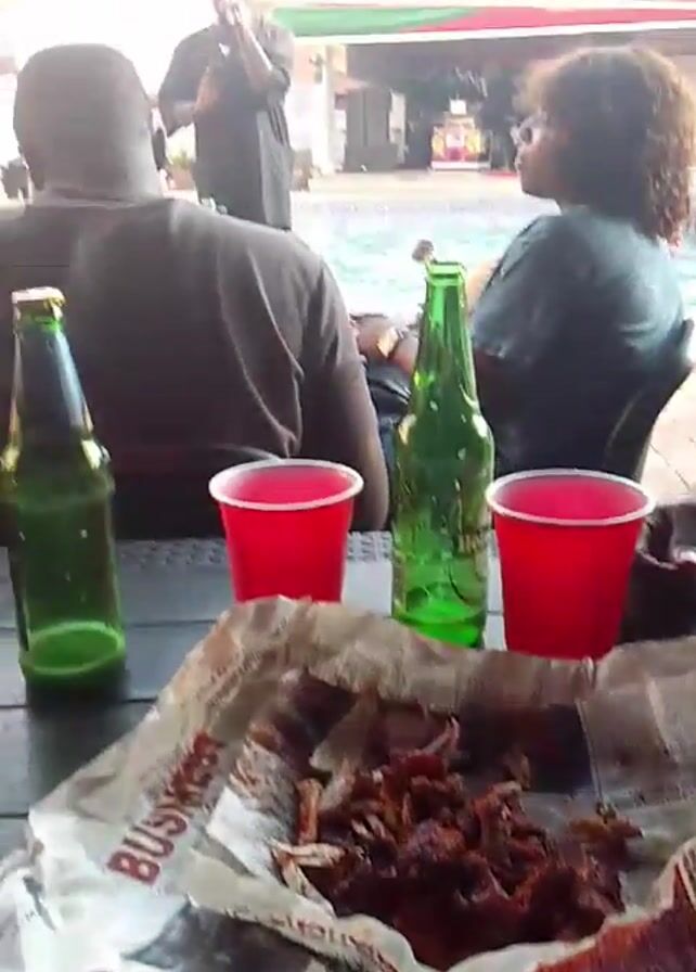 A video shows a group of people gathered around a swimming pool. In the foreground, a table holds a plate of food on newspaper, two red plastic cups, and two bottles of Heineken beer. Beyond the table, people are seated around the pool. A man stands by the pool, holding a microphone and singing. The pool has people swimming in it. A bar area is visible in the background.