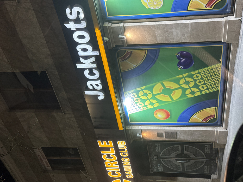This image captures the illuminated facade of a two-story commercial building at night in Ruse, Bulgaria. The ground level features two distinct establishments. On the left, "CIRCLE 7 GAMING CLUB" is displayed in prominent orange-lit signage above a pair of dark, ornate double doors, each adorned with a central circular geometric pattern. To the right, "Jackpots" is presented in large, illuminated white lettering. Below the "Jackpots" sign, expansive display windows are covered with vivid graphic advertisements depicting casino-themed imagery, including green and yellow geometric patterns resembling slot machine reels, a red sphere, two purple plums, and a sliced lemon. The building's exterior is characterized by a dark, horizontally paneled cladding. Wall-mounted light fixtures illuminate the ground-level facade. On the upper floor, two dark windows are visible, with a sign in Cyrillic characters, "БИР АНГЛИЙСКИ ЕЗИКОВИ ЦЕНТЪР", affixed to the left window. No individuals are present in the scene, and a partial view of a vehicle's front section is visible in the lower-left foreground.