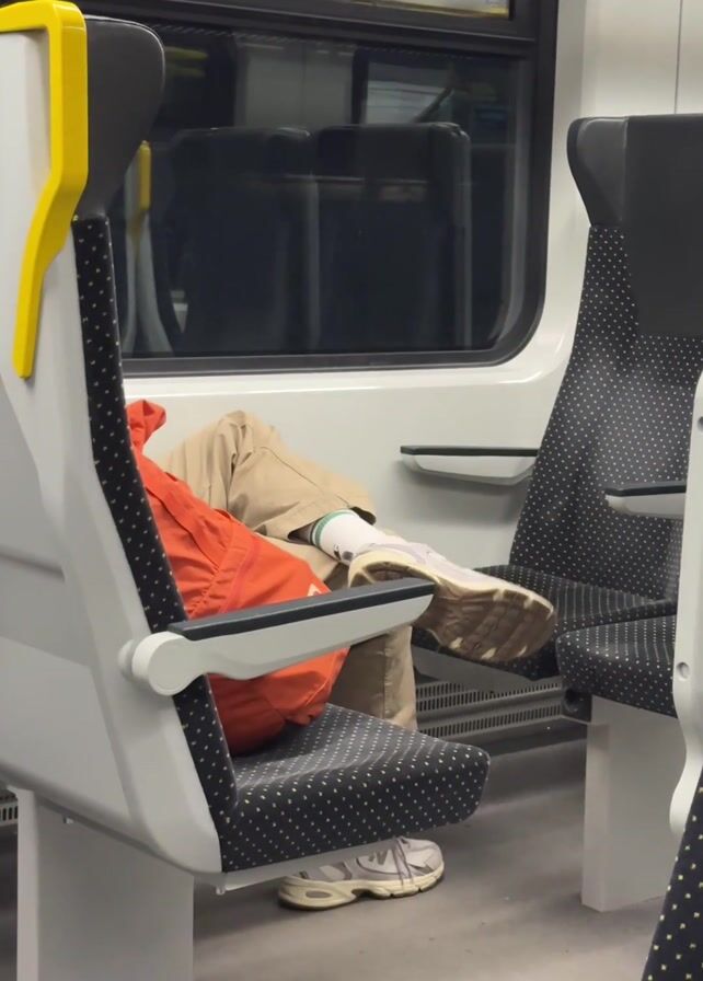 A person is seen sitting in a train, with their feet placed on the seat opposite them. The person is wearing khaki pants, white socks with green stripes, and white sneakers. Their orange jacket is slung over the side of the seat. The train car is clean with modern grey and black seats. The window behind the person is dark. The person is stationary, and there is no visible interaction with anyone else. The scene takes place inside a moving train.