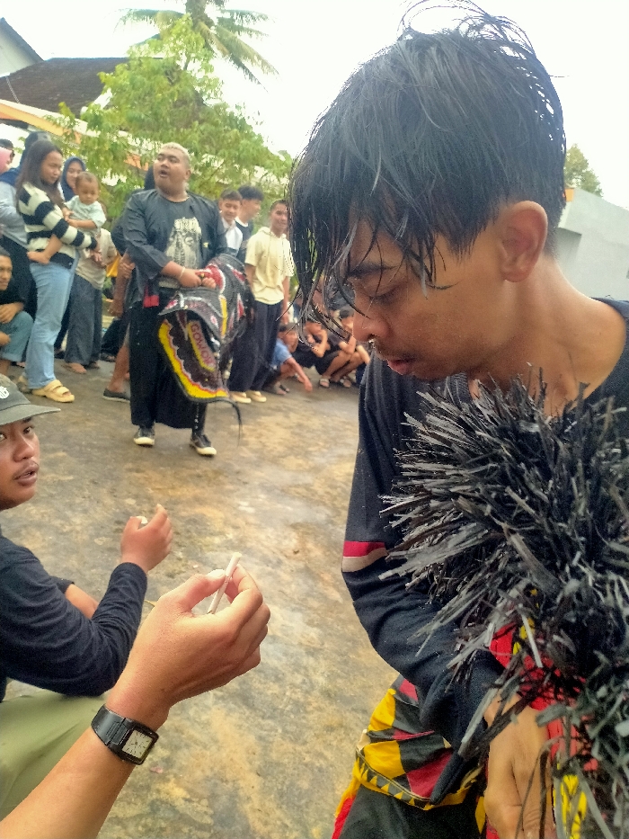 An outdoor scene in Ganten, Indonesia, depicts a gathering of individuals on a damp, light-colored paved surface, likely a village square or open area, under an overcast sky. In the right foreground, a young male with wet, dark hair, wearing a black long-sleeved shirt with a red and beige stripe on the sleeve, and a black, red, and yellow patterned lower garment, looks downwards and to the left. He holds a black, spiky, fibrous object resembling a pompom or prop against his chest. In the left foreground, another male wearing a dark long-sleeved shirt and a dark green baseball cap is visible, looking towards the camera. His right hand, adorned with a black rectangular wristwatch, holds a small, white, cylindrical object between his thumb and forefinger. In the midground, a heavier-set male with short, light-colored hair, wearing a black long-sleeved shirt with a white graphic and black trousers, holds a decorative prop resembling a hobbyhorse or an animal's head, predominantly white, yellow, and black, with the word "GOWOR" visible. He looks upwards and to the left, with an open mouth, suggesting he is speaking or singing. Behind these central figures, a group of spectators observes the scene. This group includes a female in a black and white striped shirt holding an infant, and several other individuals, primarily males, standing or crouching. A palm tree and light-colored buildings are visible in the background.