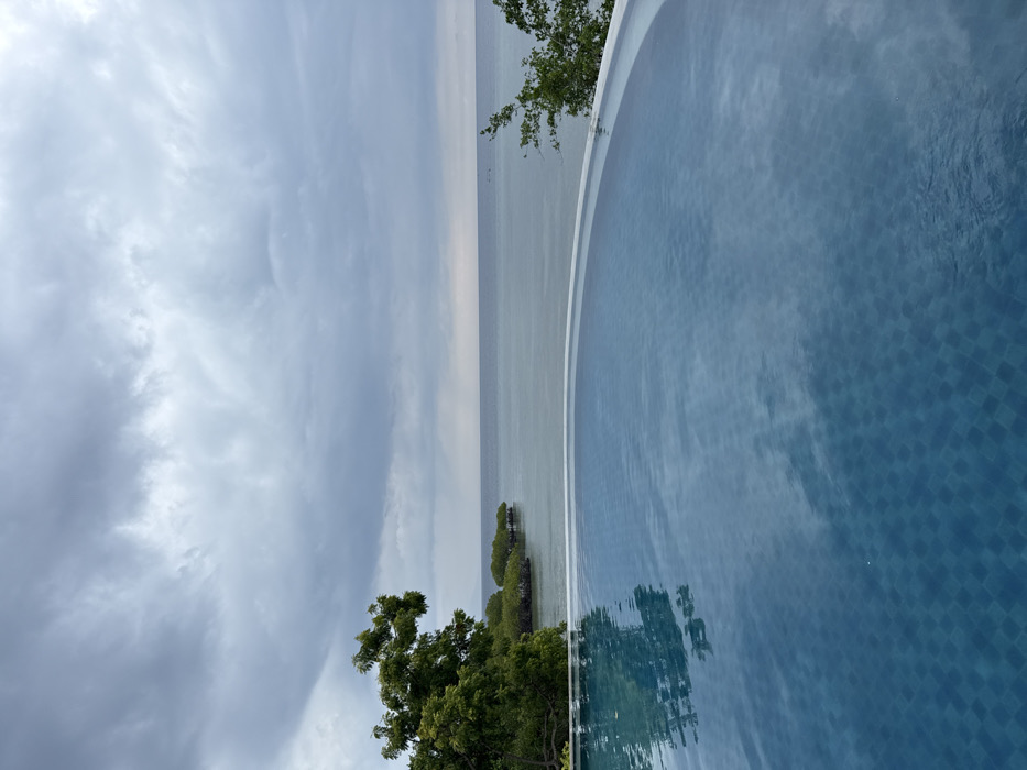 A serene, slightly tilted view captures an infinity pool merging seamlessly with the ocean under a cloudy sky. Lush green trees frame the lower left, contrasting with the blue hues of the pool and sea. The water's surface reflects the sky, blurring the line between the man-made pool and the natural horizon. A hint of vegetation dots the shoreline, adding depth to the scene. The overall impression is one of tranquility and relaxation.