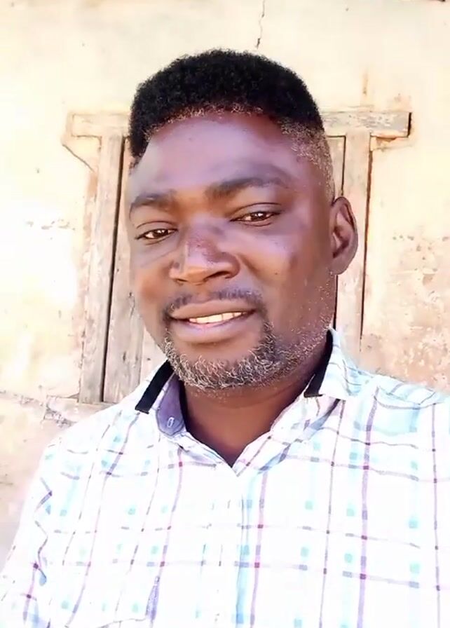 A medium shot captures a man with dark skin and a short, neatly trimmed afro. He has a light beard with gray hairs, and he is wearing a white button-down shirt with a blue and pink plaid pattern. He is smiling slightly and looking directly at the camera. The background includes a weathered wooden door and a section of a building with a simple roof. The lighting appears to be natural daylight. There is a green tree visible in the background. The camera angle seems to be slightly upward, suggesting the video might have been taken by holding the camera.