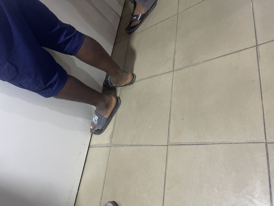 Two pairs of legs stand on a tiled floor. One pair wears blue shorts and black slides with white lettering. The other pair wears grey pants and black flip-flops. The tiled floor is light beige with darker grout. Part of a white wall is visible near the left edge of the image. The perspective is a high angle, and the composition is off-center.