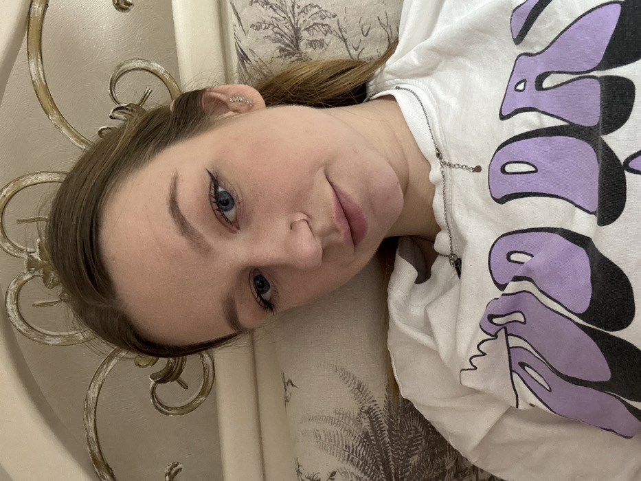 The image depicts a young Caucasian female posing for a self-portrait indoors. She has light brown hair, blue eyes, and fair skin. Her gaze is directed towards the camera with a neutral expression. Visible facial features include a small silver-colored hoop nose ring in her left nostril and a silver-colored ear cuff or multiple small earrings on her right ear. She is wearing a white t-shirt with large, stylized purple lettering, partially legible as "OOD DA", across the chest. A silver-colored chain necklace with a small pendant and an extender chain is visible around her neck. She appears to be reclining or lying down against bedding. The background reveals a light-colored headboard with ornate, possibly gilded, scrollwork detailing. A pillow with a patterned fabric, featuring dark botanical or foliage motifs, is partially visible behind her head and shoulder. There are no identifiable markers in the image to confirm the specific location in the city of Tlustenkhabl, Russia.