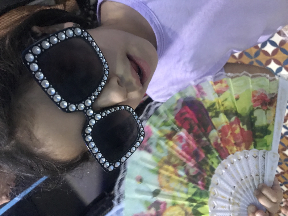 This image depicts a young individual, likely a child, located in Ouislane, Morocco. The subject is presented in a close-up, wearing oversized, square-framed sunglasses with dark lenses. The black frames of the sunglasses are extensively embellished with rows of circular rhinestones along their upper and lower edges. The individual is dressed in a plain, light purple short-sleeved t-shirt. The subject's left hand holds an open folding hand fan, which features a vibrant floral pattern with prominent red, yellow, and green elements on a lighter background. The lower section of the fan, including its white slats and a small portion of a textured pattern, is visible. The subject's mouth is slightly ajar. The background, largely out of focus, reveals a geometrically patterned tiled surface or floor in the lower right, composed of interconnected light brown, orange, and white diamond or square shapes. Indistinct dark elements are present in the upper left background.