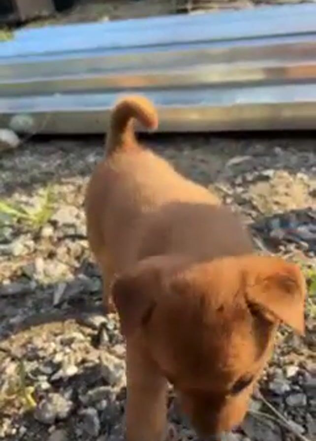 A brown puppy stands on gravel. The puppy has a short, curled tail. There is a metal sheet behind it, along with some trash. The puppy turns its head to look off to the side.