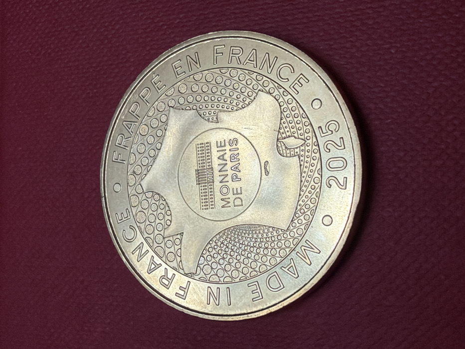 The image displays a circular, metallic commemorative object, likely a medal or token, positioned against a dark reddish-brown, textured background. The object's obverse features a central, stylized outline of the map of France. Within this outline, a building structure is depicted, identified by the inscription "MONNAIE DE PARIS" directly beneath it. The internal area of the French map is patterned with a series of concentric circles of varying sizes. The outer rim of the circular object is inscribed with uppercase text: "MADE IN FRANCE" along the left arc, "FRAPPE EN FRANCE" along the top-right arc, and the year "2025" at the bottom. Small circular dots separate sections of the rim inscription. The metal appears to be a light silver or gold tone, showing minor surface imperfections. The scene is static, showing no individuals or active interactions, and is located in the city of Blagoevgrad, Bulgaria.