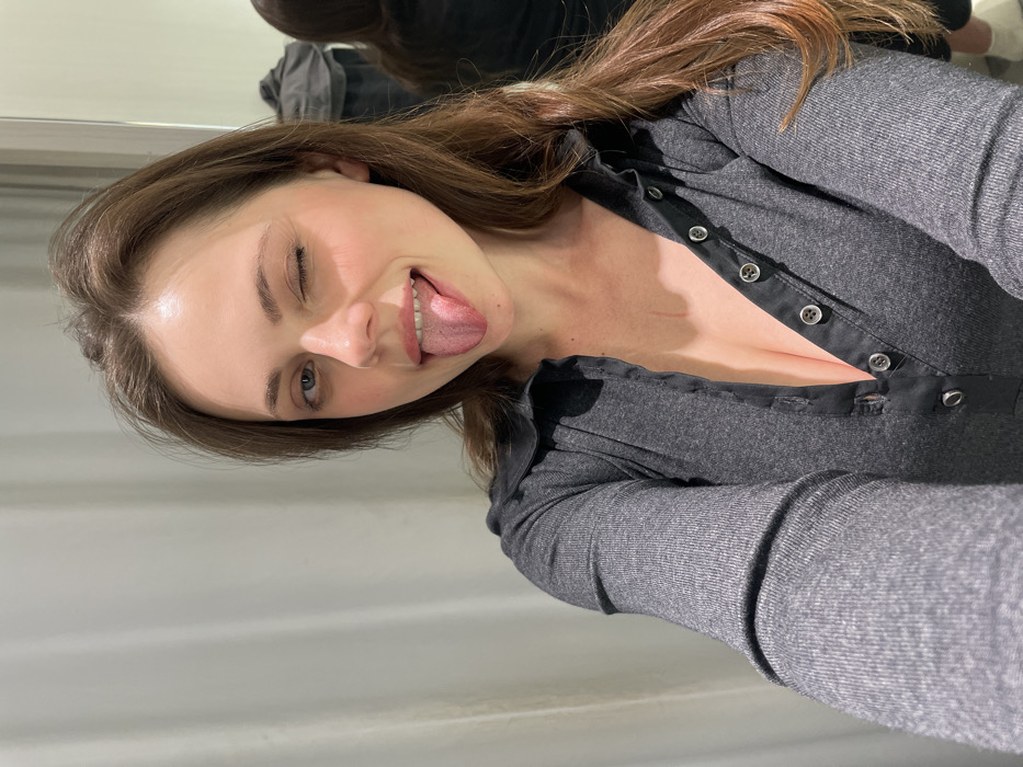 A young woman winks and sticks out her tongue in a playful selfie. She has long brown hair and fair skin, wearing a gray button-up shirt with a hint of cleavage showing. Her head is slightly tilted, and she appears to be in a well-lit indoor space with a textured white wall behind her. Another person is partially visible in the background.