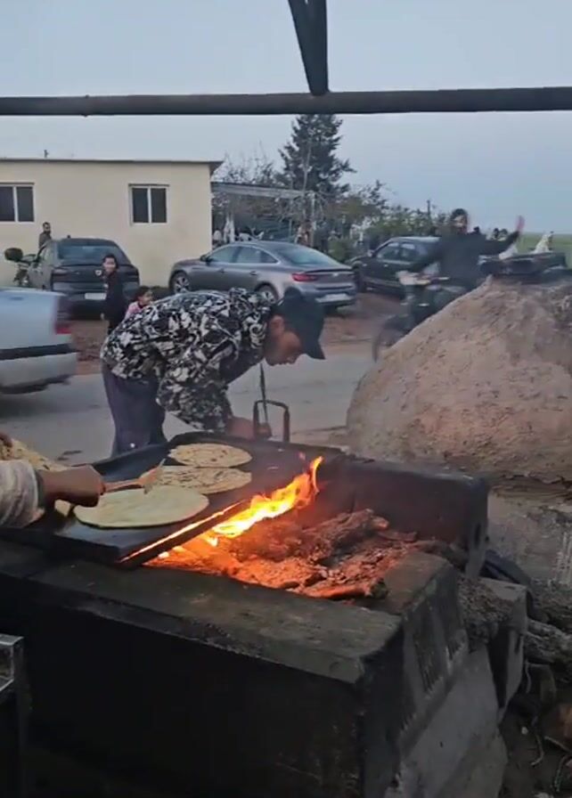 Two people are cooking on an outdoor, charcoal-fired grill. One person, wearing a light purple sweater and a dark head covering, stands to the left, using a spatula to flip flatbreads on the griddle. The other person, dressed in a patterned shirt and a baseball cap, stands to the right, arranging the flatbreads on the grill above the flames. A stack of cooked flatbreads sits on a plate on a marble-patterned surface. A traditional clay oven is visible to the right of the grill. Cars pass by in the background, and several people are visible in the distance. The cooking area is covered by a simple metal roof structure. The overall environment suggests a roadside food stall or outdoor market.