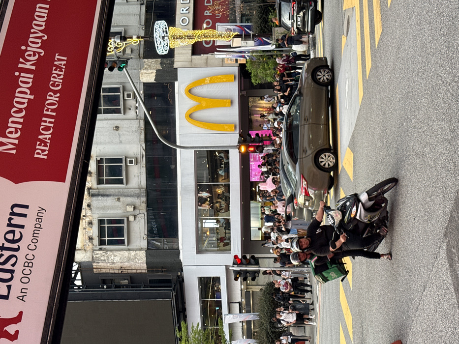 The image presents a busy urban intersection in Kuala Lumpur, Malaysia, specifically at the intersection of Jalan Bukit Bintang and Jalan Sultan Ismail. In the foreground, a dark and silver motorcycle with two occupants navigates the asphalt roadway, marked with yellow chevron-style crosswalk lines. The driver wears a dark helmet and shirt, looking forward. The passenger, also in a dark helmet and shirt, carries a prominent green square delivery bag on their back. Adjacent to the motorcycle, a dark brown sedan is in motion, followed by a stationary black SUV on the right. The midground is dominated by a McDonald's restaurant featuring its large golden arches sign. The establishment occupies the ground and first floors of a building, with expansive glass windows revealing numerous patrons seated and dining inside. A significant crowd of pedestrians is gathered on the sidewalk opposite the vehicles, some observing the street, others engaged in conversation or using mobile phones. To the right of McDonald's, a building facade displays a column of decorative yellow string lights and a large, illuminated white ring ornament. Multiple traffic lights are visible; one shows a red light for the vehicles in the foreground, while another displays a green light for traffic on the perpendicular street. The background reveals multi-story urban architecture, including older buildings with grey, textured facades and numerous rectangular windows. Above the street level, a large red banner spans the upper portion of the frame, displaying "Mencapai Kejayaan" (Reach for Great) in white text, along with "Eastern An OCBC Company." A large, dark digital billboard screen is partially visible on the left. The scene is illuminated by daylight, indicating a bustling commercial district during the day.