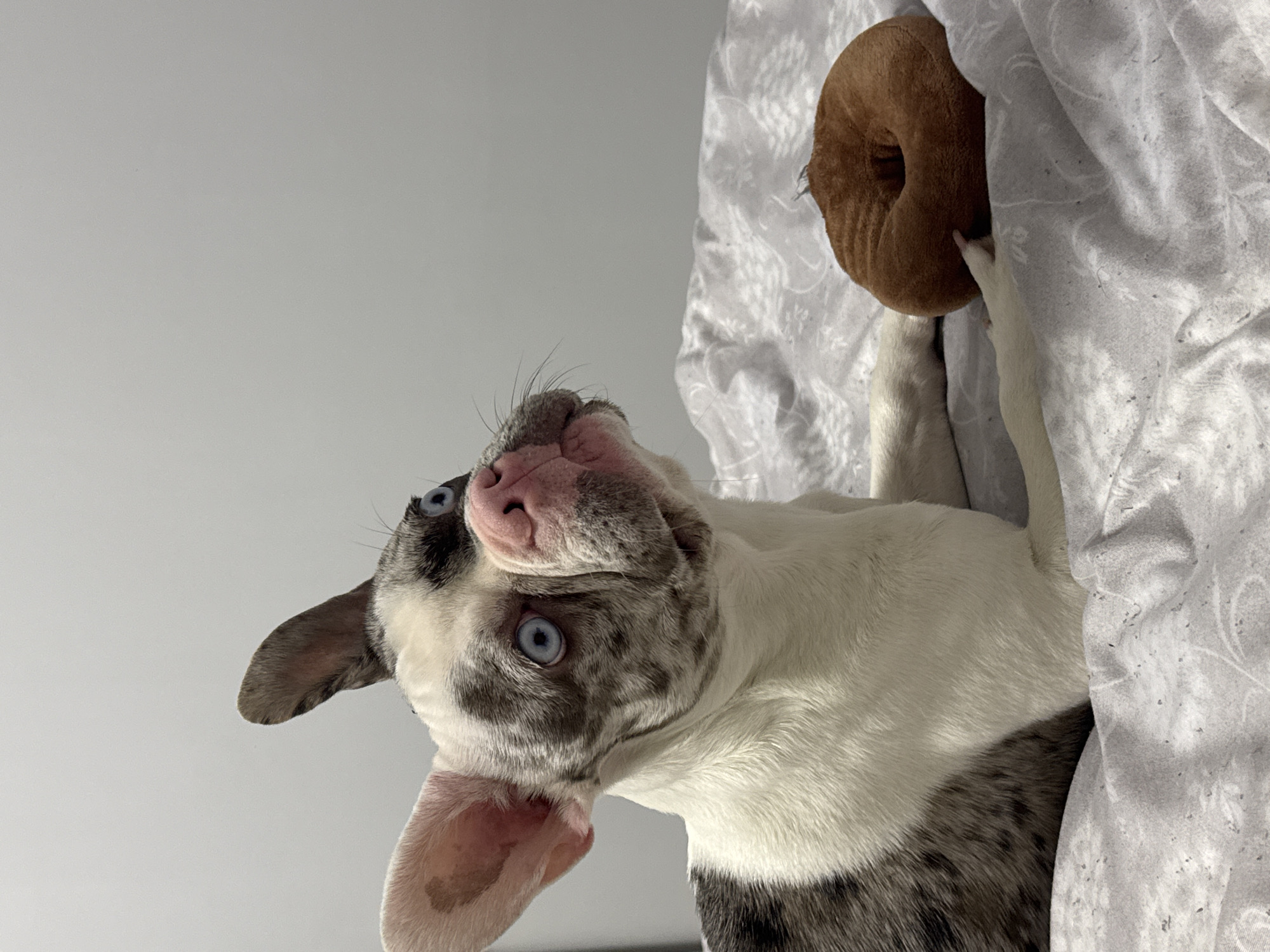 A dog with speckled gray and white fur and piercing blue eyes is lying on its back. The dog has a pink nose and one ear is flopped over, while the other is erect. It's positioned against a gray patterned fabric, and holding a brown donut-shaped toy. The background is a plain, light gray wall. The location and city of Sofia, Bulgaria are not deducible from the image.
