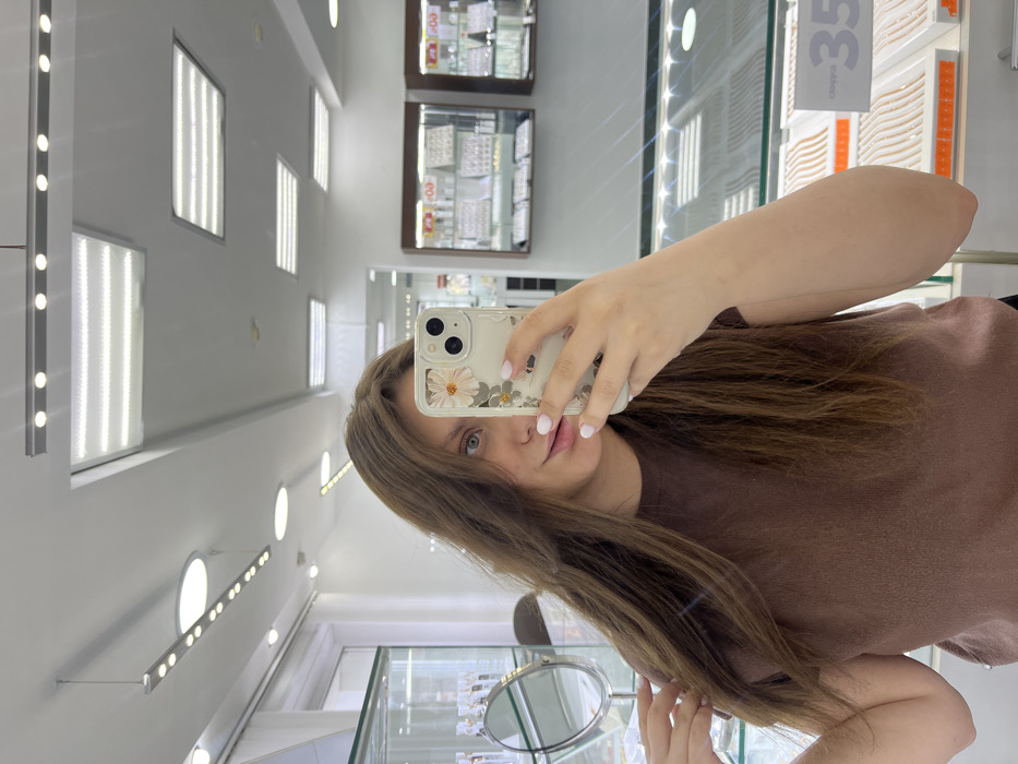 An indoor mirror selfie captures a woman in a retail establishment in Chaikovsky, Russia, identified as a jewelry store. The woman, with long brown hair, visible right eye, and light-colored lips, wears a brown short-sleeved top. She holds a white smartphone with a clear floral-patterned case in her right hand, obscuring the lower left portion of her face. Her left hand is raised, fingers lightly touching her hair on the left side. Both hands feature white manicured nails. The background, reflected in the mirror, shows a brightly lit store interior with a white ceiling featuring multiple linear track lights and large rectangular recessed fluorescent panels. Various glass display cases are visible; one on the left contains small items and a circular vanity mirror, while several on the right, with dark frames, display numerous jewelry pieces (rings, necklaces) on white and dark stands. A price tag with "35" and Cyrillic text is visible in one display case. The floor is reflective, showing light reflections.