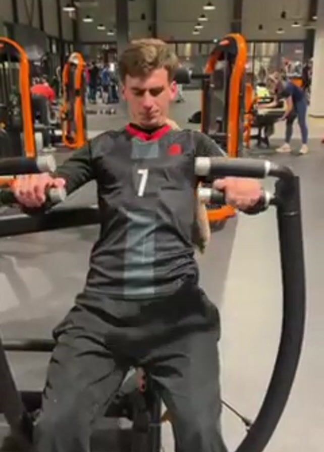 A young man is using a machine at the gym