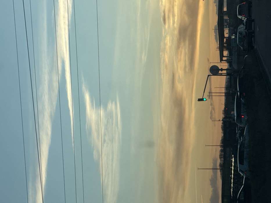 A sideways view of a highway at dusk. The sky transitions from a blue hue with cloud streaks to a golden orange. Power lines run along the sky. The highway is lined with cars, with taillights visible on some. A traffic light shows green, positioned over the line of cars. A signpost and other highway infrastructure are visible, blending into the twilight scene.