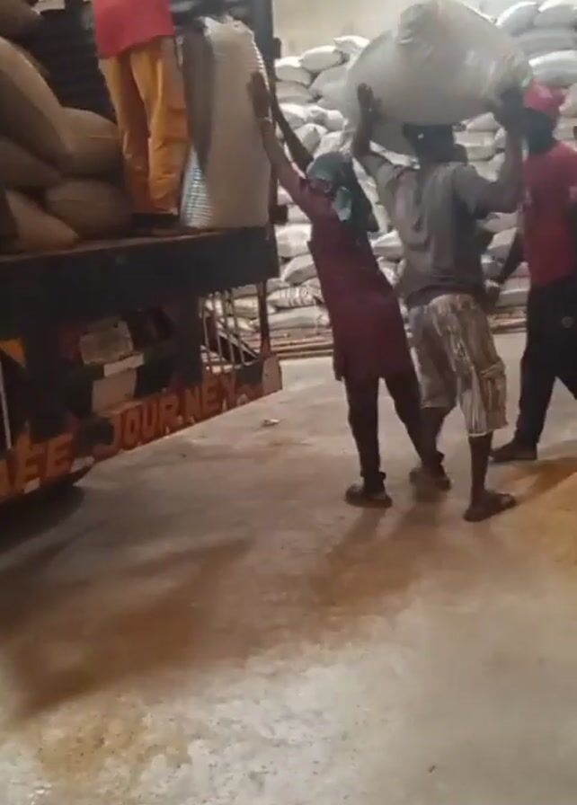 group of men unloading large sacks from a truck inside a warehouse. The men are carrying the sacks on their heads and backs, moving them from the truck to a large pile of similar sacks stacked against the warehouse wall. Some of the men are wearing red shirts. The truck has the words "SAFE JOURNEY" painted on the back. The warehouse appears to be lit by natural light coming through a window in the roof.