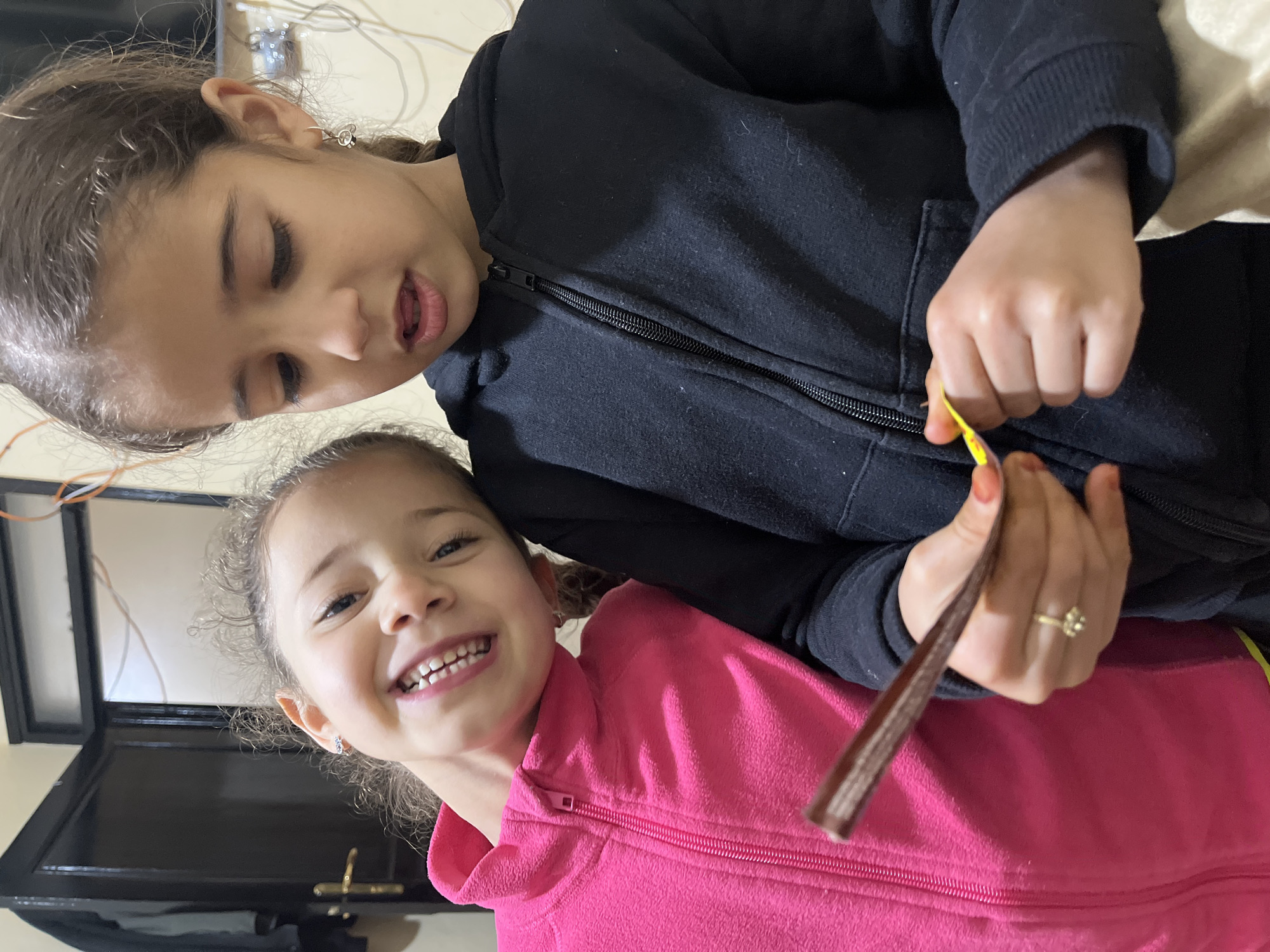 Two young girls are positioned closely together. The girl in the foreground wears a pink zip-up fleece jacket and smiles directly at the camera. The girl behind her is wearing a black zip-up fleece. She looks down at an object in her hands, which appears to be a strip of material or a thin rod. The photo appears to be taken indoors, possibly in a home, with a doorway and assorted cables visible in the background. There is no indication of the location in Ouaouizert, Morocco.