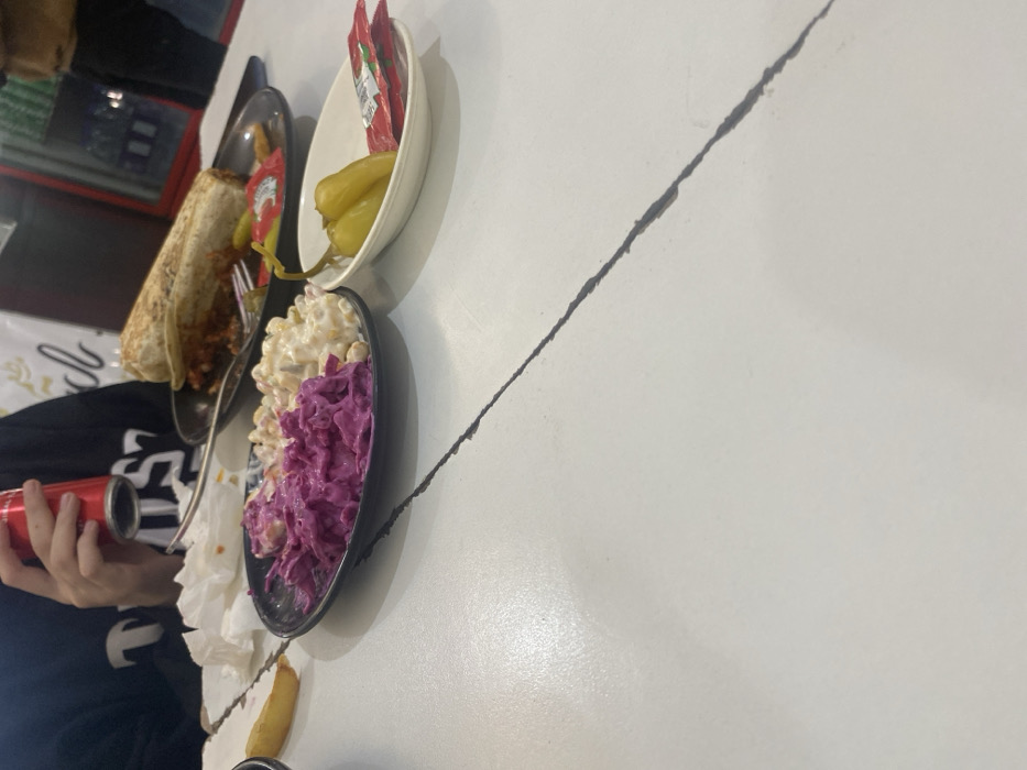 This image depicts a meal served on a white table within a food establishment located in the city of Deir el-Balah, Palestinian Territory. A person, whose right hand is visible on the left, holds a red soda can. This individual wears a dark long-sleeved shirt with white lettering. Adjacent to their hand are a crumpled white paper napkin and a single golden-brown french fry. Centrally positioned, a small black fluted-edge plate holds two distinct salad portions: one composed of purple cabbage and another appearing to be a creamy pasta or vegetable salad. Behind this, a larger black oval plate presents a large sandwich or wrap, cut in half to reveal a reddish-brown filling, with a silver fork resting on it. To the right of the salads, a small white oval dish contains two light green pickled peppers and two red condiment packets. The white table surface features a distinct dark, irregular line running diagonally from the bottom-left to the upper-right. The background includes a partial view of a white banner with black Arabic script on the left and a dark red refrigerator or display unit with visible bottles on the right. A second person's dark-clad shoulder is partially visible on the far right.