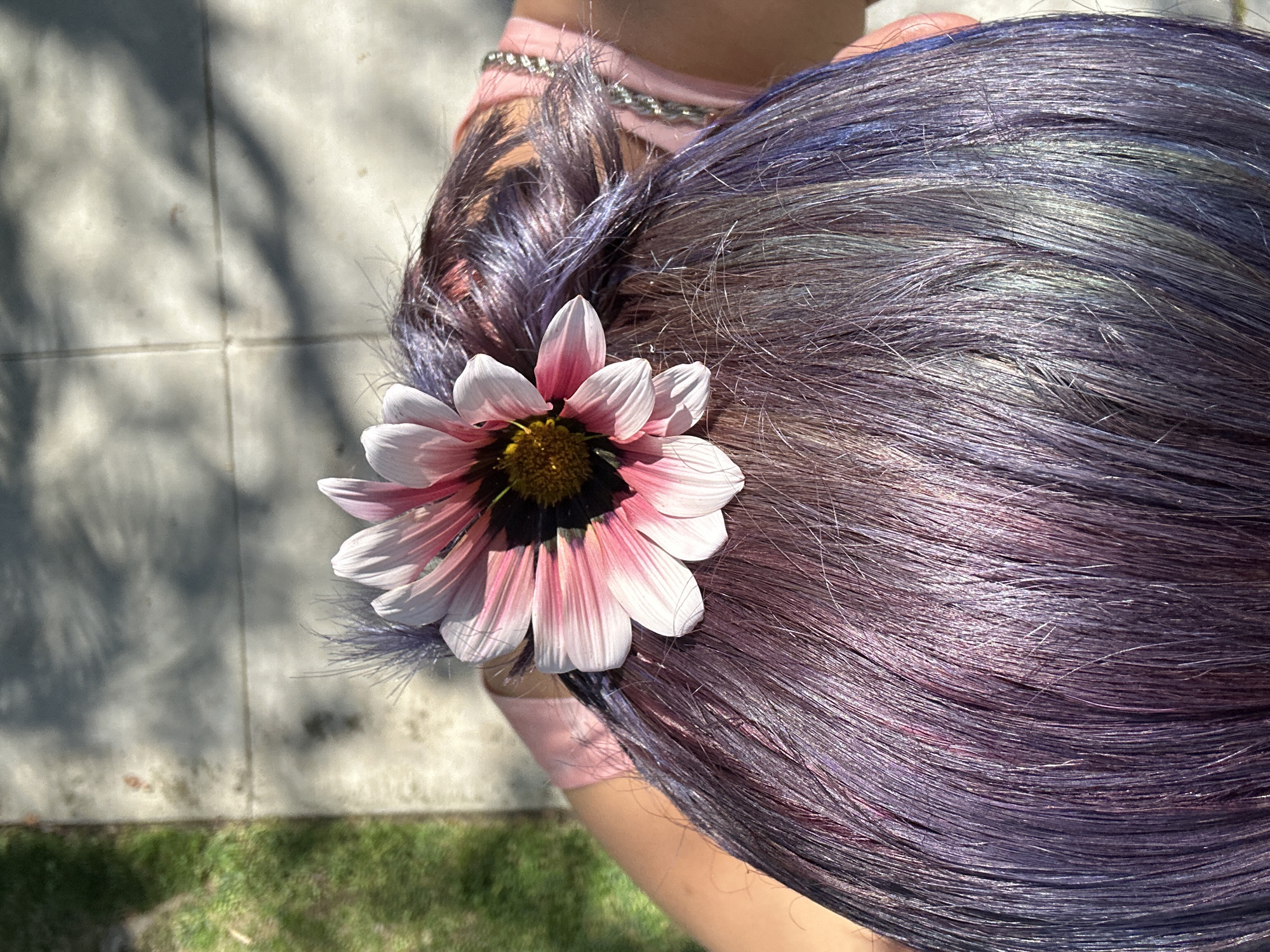 A high-angle close-up shot shows a person with dyed purple-gray hair styled with a pink and white flower
