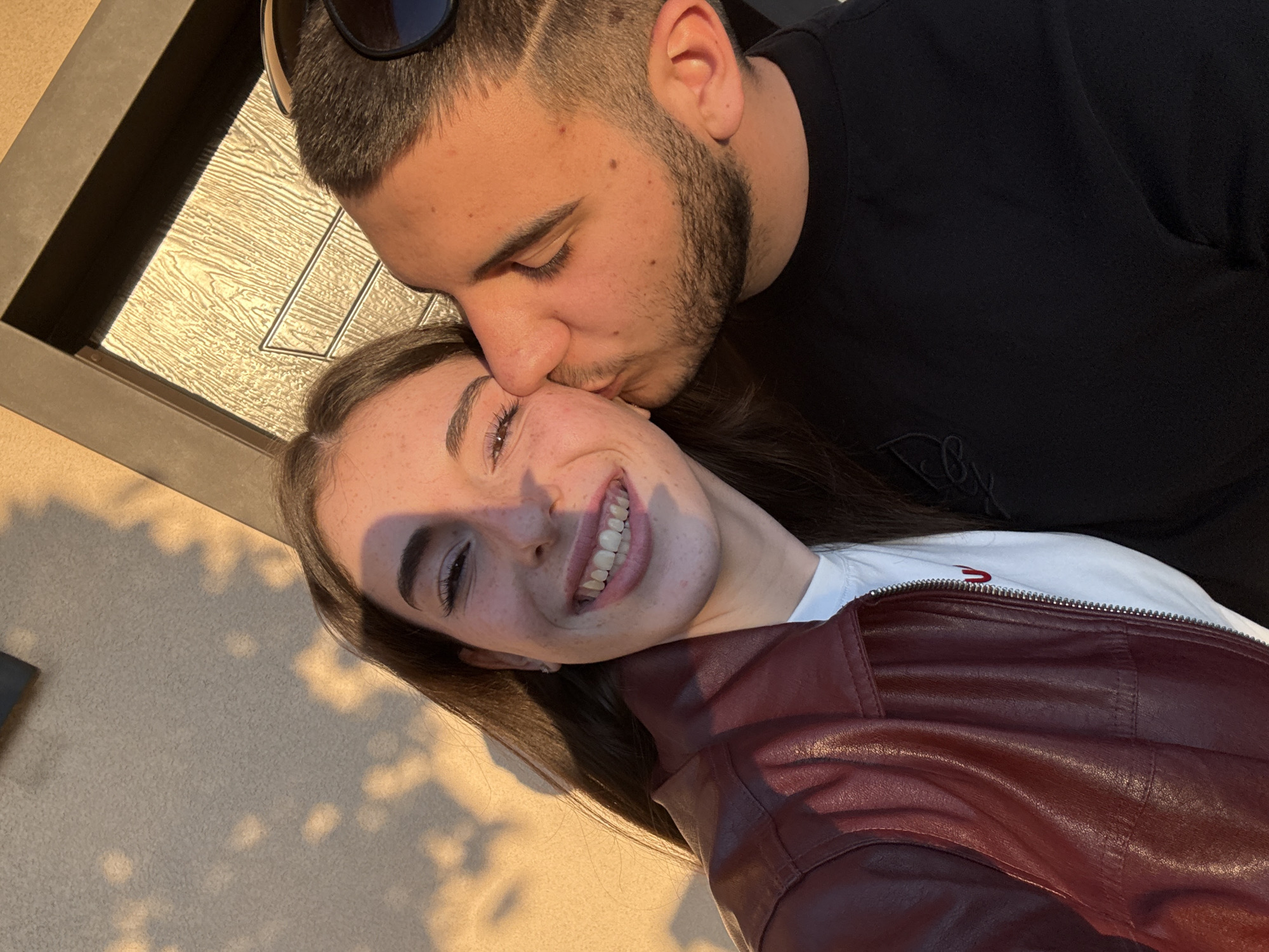 A medium-shot photograph captures a man kissing a woman on the forehead. The man has dark hair and a beard, and is wearing sunglasses on his head and a black shirt. The woman has long brown hair, freckles, and is wearing a white shirt and a burgundy leather jacket. They are both smiling. The background appears to be an outdoor setting with natural light. The precise location in Trud, Bulgaria, cannot be determined.