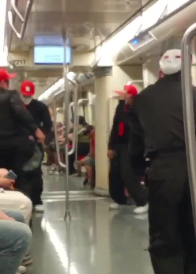 Inside a subway car with silver walls, five men in black outfits, red ties, and red baseball caps with the letter "M" are dancing for the passengers. They also wear white masks covering their faces. Most passengers are sitting, watching the dancers, while a few stand. The floor is shiny and reflective. Metal poles are visible, along with a digital sign displaying the station name. The train is in motion.