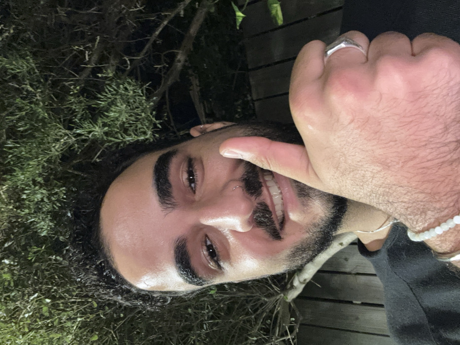 A close-up image depicts a male subject smiling directly at the camera, offering a thumbs-up gesture with his right hand. The man has dark, curly hair, thick eyebrows, dark eyes, a light beard, and visible white teeth. He wears a silver hoop nose ring on his left nostril and a silver stud in the upper helix of his right ear. Accessories include a silver chain necklace, a silver ring on his right pinky finger, and a white beaded bracelet on his right wrist. He is wearing a dark-colored top. The background is dark, revealing illuminated green foliage, likely bushes or trees, with a partially visible wooden fence or structure behind them. The setting appears to be outdoors at night, under artificial lighting. The precise location within Tel Aviv, Israel, cannot be ascertained from the visual evidence present in the image.