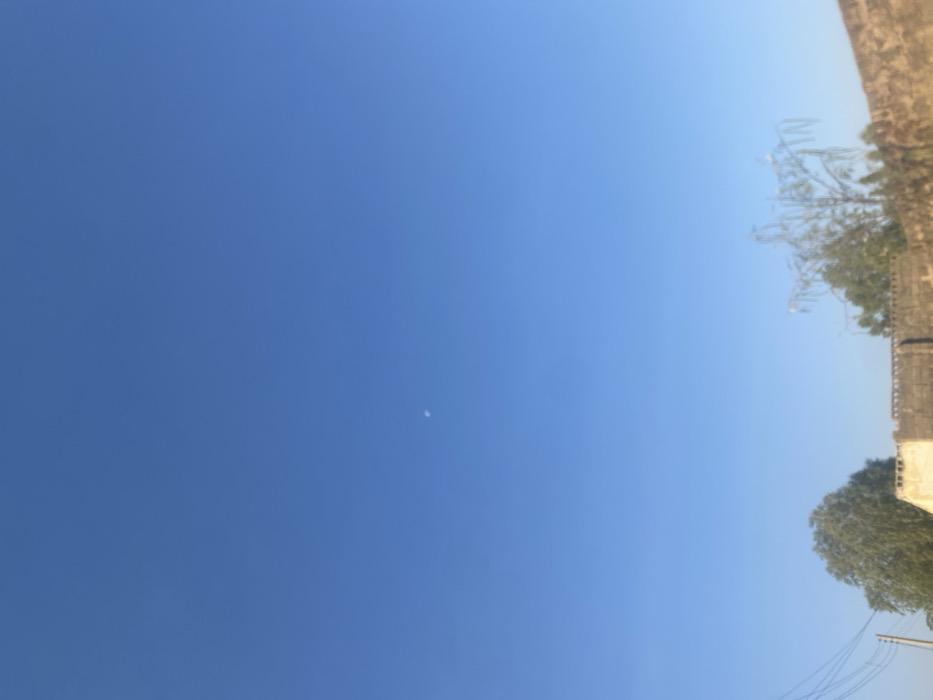 A mostly clear, blue sky fills the frame, with a faint crescent moon visible near the center. A tree with green leaves and electrical wires occupy the bottom right corner. An aged, tan wall and foliage extend along the upper right side. The sky dominates the view, offering a sense of openness and daylight.