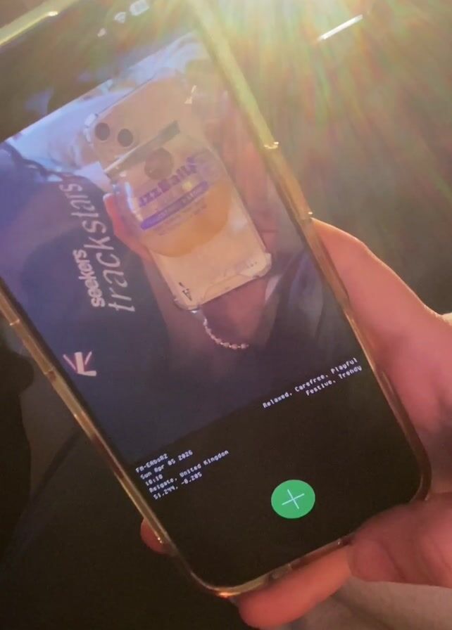 A person is holding a phone and filming another phone’s screen. The screen shows a picture of a phone case with the words “Fizz Balls” on it. The image is overlaid on a TikTok interface with various details about the video. A finger then taps the screen. Sunlight shines brightly on the scene.