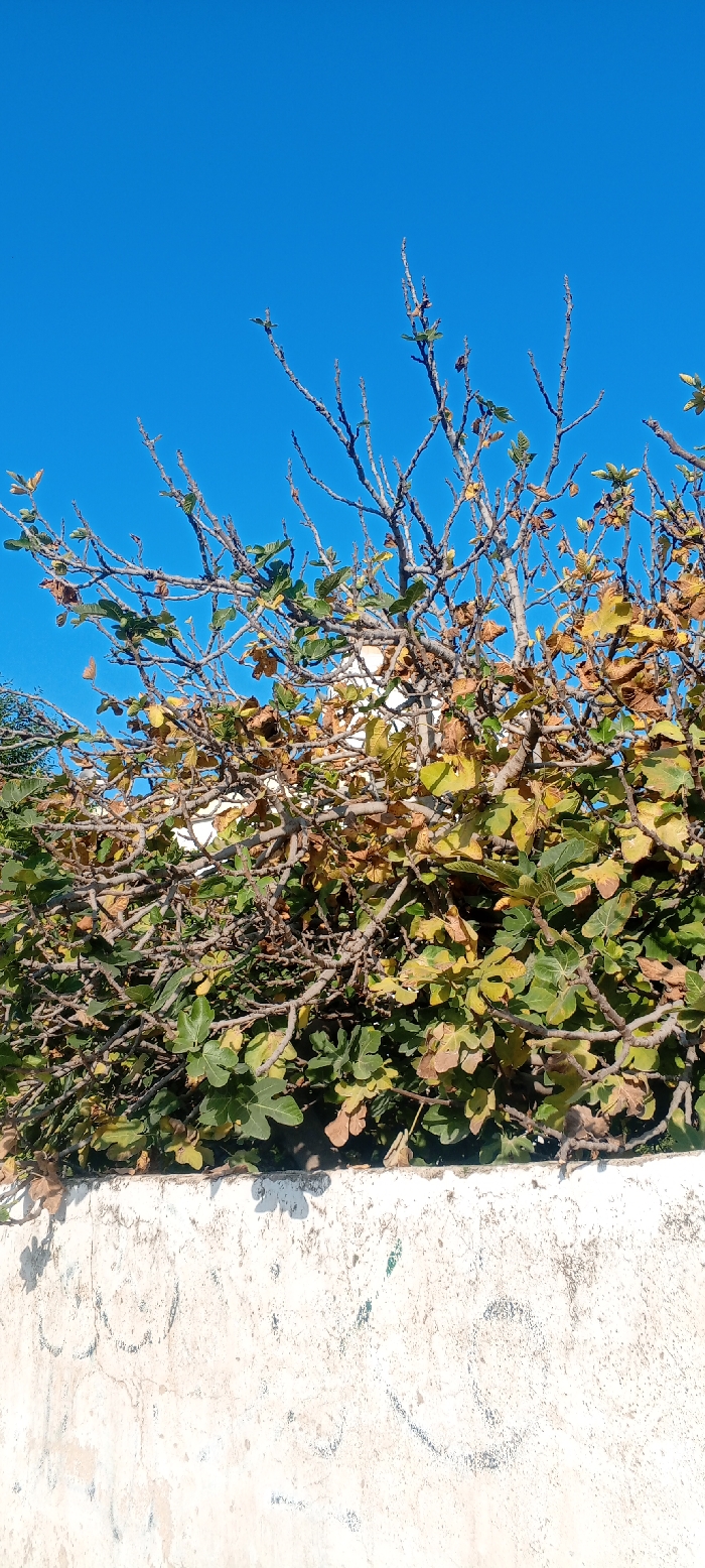 The scene is an outdoor daytime shot in الشيخ حسين قرية, Jordan. The primary subject is a dense, deciduous tree or large bush, occupying the central and upper portions of the frame. Its foliage displays a mix of vibrant green leaves, numerous leaves transitioning to yellow and brown, and many bare branches. Above the tree, a clear, bright blue sky is visible, indicating fair weather. Through gaps in the tree's branches, a section of a white or light-colored building is discernible in the mid-ground. The foreground consists of a textured, off-white concrete or stucco wall, showing signs of weathering and faint, dark markings or graffiti. No individuals or active subjects are present in the image.