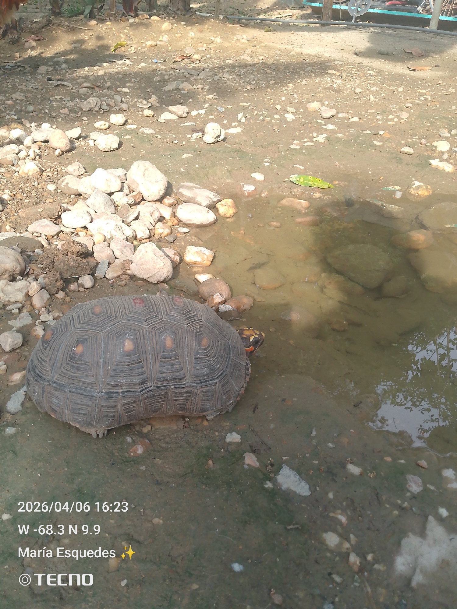 Red-footed tortoise next to a puddle. The tortoise's shell has a patterned design with lighter colored spots. The ground is muddy with scattered rocks. The puddle reflects the sky and foliage. In the bottom left corner, there's text indicating the date (2026/04/06), time (16:23), location coordinates (W -68.3 N 9.9), and the name "Maria Esquedas," along with the brand "Tecno." The location is Unknown, Unknown.