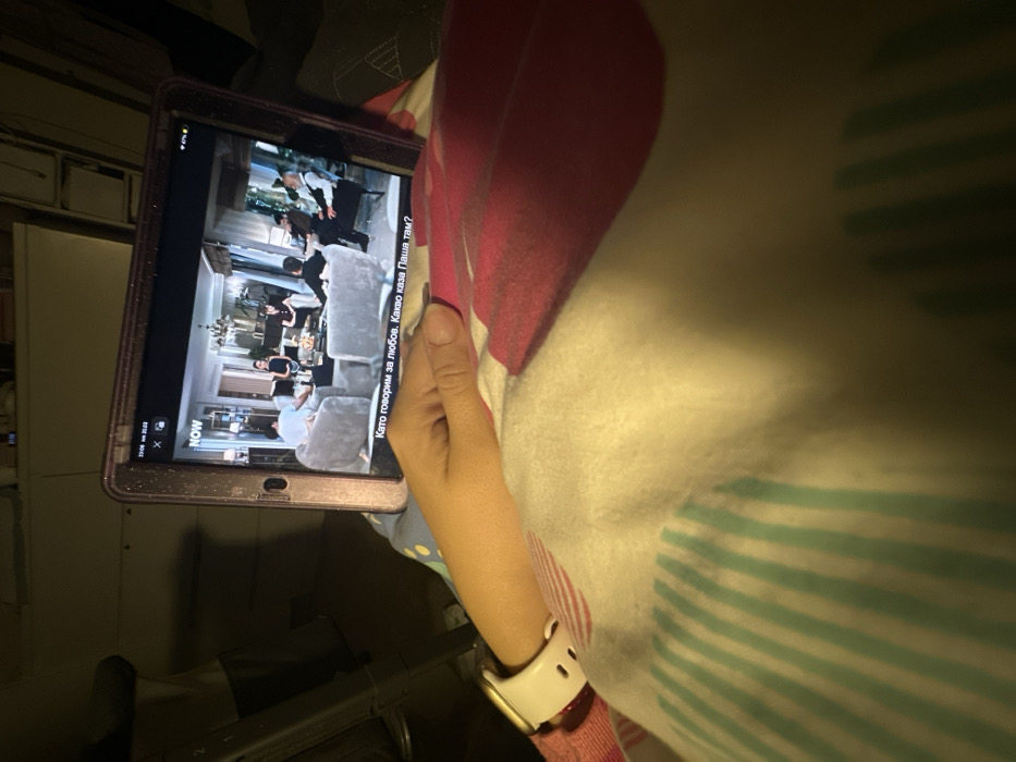 A high-angle, close-up photograph depicts a person's right arm and hand positioned beneath a tablet computer, observed within an indoor, dimly lit environment, presumed to be in Macclesfield, United Kingdom. The individual's hand, exhibiting pale skin and short fingernails, rests on a patterned blanket or duvet featuring horizontal light blue and white stripes, transitioning to a solid white and then a section of pink/red fabric. A white smartwatch with a white strap is visible on the person's left wrist. The tablet, encased in a glittery pink-purple protective cover, displays video content. The screen shows an interior scene with multiple individuals (approximately six to seven) seated in light-colored armchairs arranged in a semi-circle within a well-appointed room, possibly a lounge or living area. A small coffee table is centered between them. Overhead, a chandelier is visible. Text overlays on the tablet screen include "23:00 Bbl 20:03", the word "NOW", and a subtitle in Bulgarian: "Като говорим за любов. Какво каза Паша там?" (Translation: "When we talk about love. What did Pasha say there?"). The tablet is positioned upright, suggesting it is resting against something or held in a specific manner. The background beyond the blanket is dark and indistinct, showing faint outlines of what might be furniture or room features.