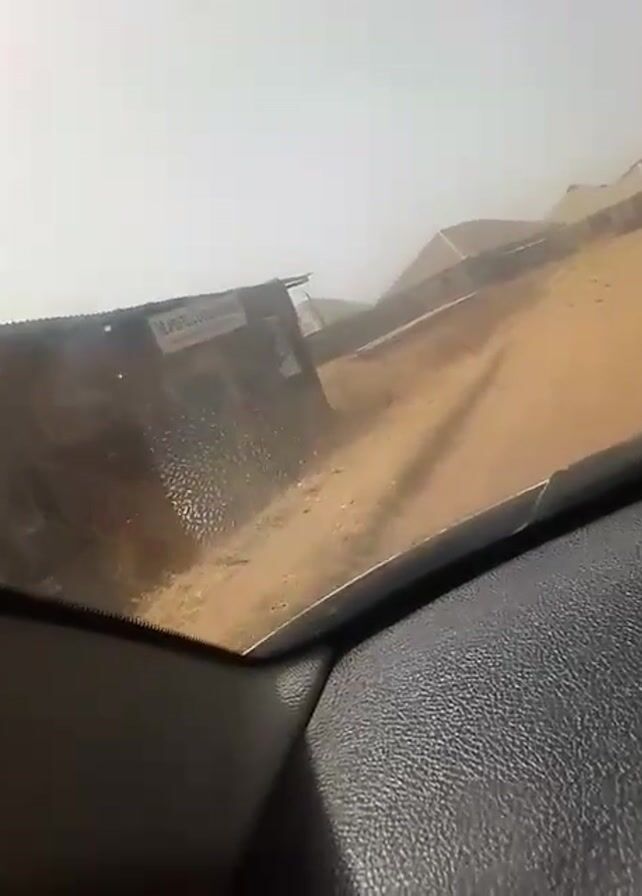 The video is taken from inside a car, looking through the windshield at a dirt road. On the left is a small, run-down shack. Further down the road are houses with light-colored roofs, typical of a rural setting. The overall visibility is poor, with a hazy or dusty atmosphere. The car appears to be moving slowly down the road. There are people walking on the road in the distance.
