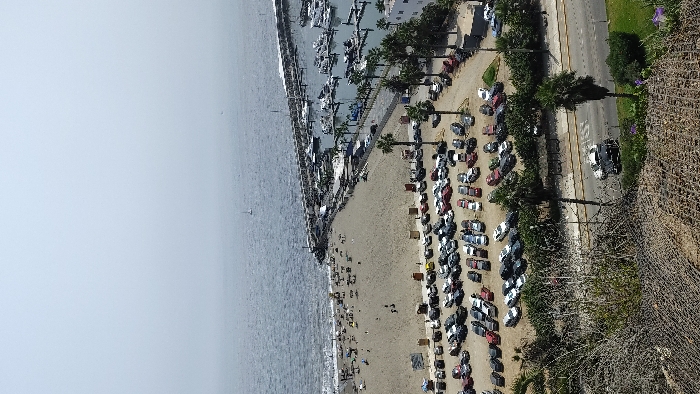 This is an elevated view of a coastal scene in Barranco, Peru, observed on a hazy day under light conditions