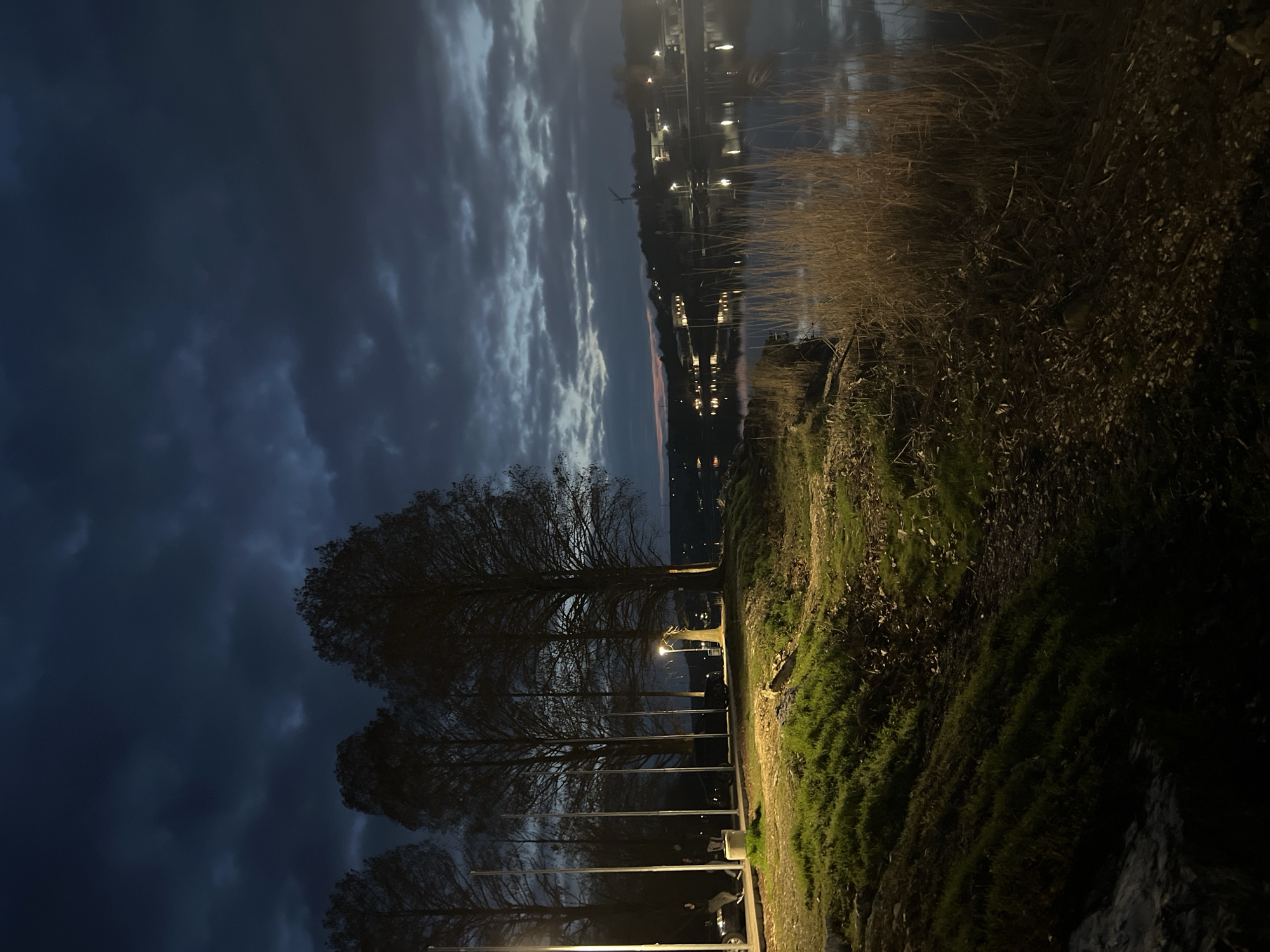 This is an outdoor nighttime scene at an undetermined location in the city of Nikolovo, Bulgaria. The image is taken from ground level with a horizontal orientation. The composition features a dark, cloudy sky transitioning to a skyline dotted with distant, glowing lights, likely from buildings across a body of water. The water's surface reflects some of these lights. Reeds or tall grasses line the water's edge on the right side of the frame. In the foreground, several bare trees are silhouetted against the sky. A row of lit lamp posts extends into the scene, illuminating a pathway or road lined with green grass and patches of bare earth or debris. The lighting from the lamps casts strong shadows. No people are visible in the image.