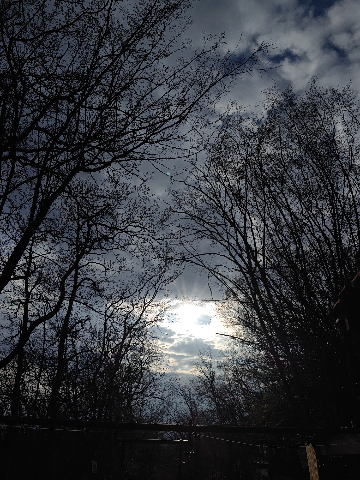 The image depicts a view through bare trees towards a partly cloudy sky, with the sun breaking through the clouds in the center of the frame