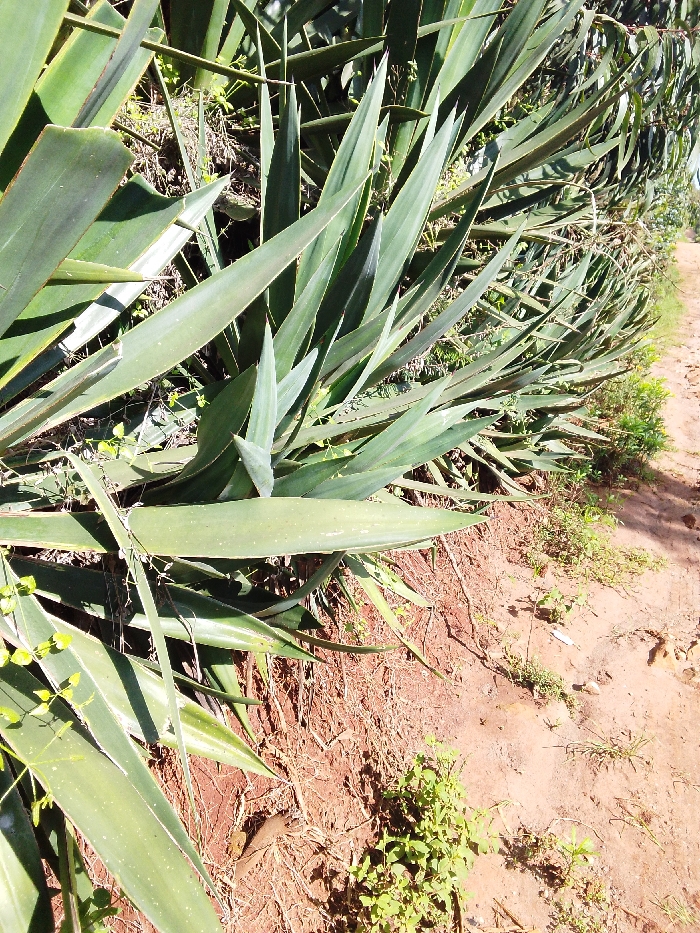 The image displays an outdoor scene in Ndeiya, Kenya. A dense row of tall, green, sword-shaped plants, consistent with sisal or agave, dominates the left and central portions of the frame. These plants emerge from reddish-brown soil, which is visible in the foreground and beneath the foliage. To the right of the plant row, a narrow, unpaved dirt path, also reddish-brown, extends into the background. Small green weeds and dry vegetation are sparsely scattered on the ground alongside the path and at the base of the larger plants. The scene is brightly illuminated by natural sunlight. No people, specific man-made objects, actions, or interactions are present in the image.