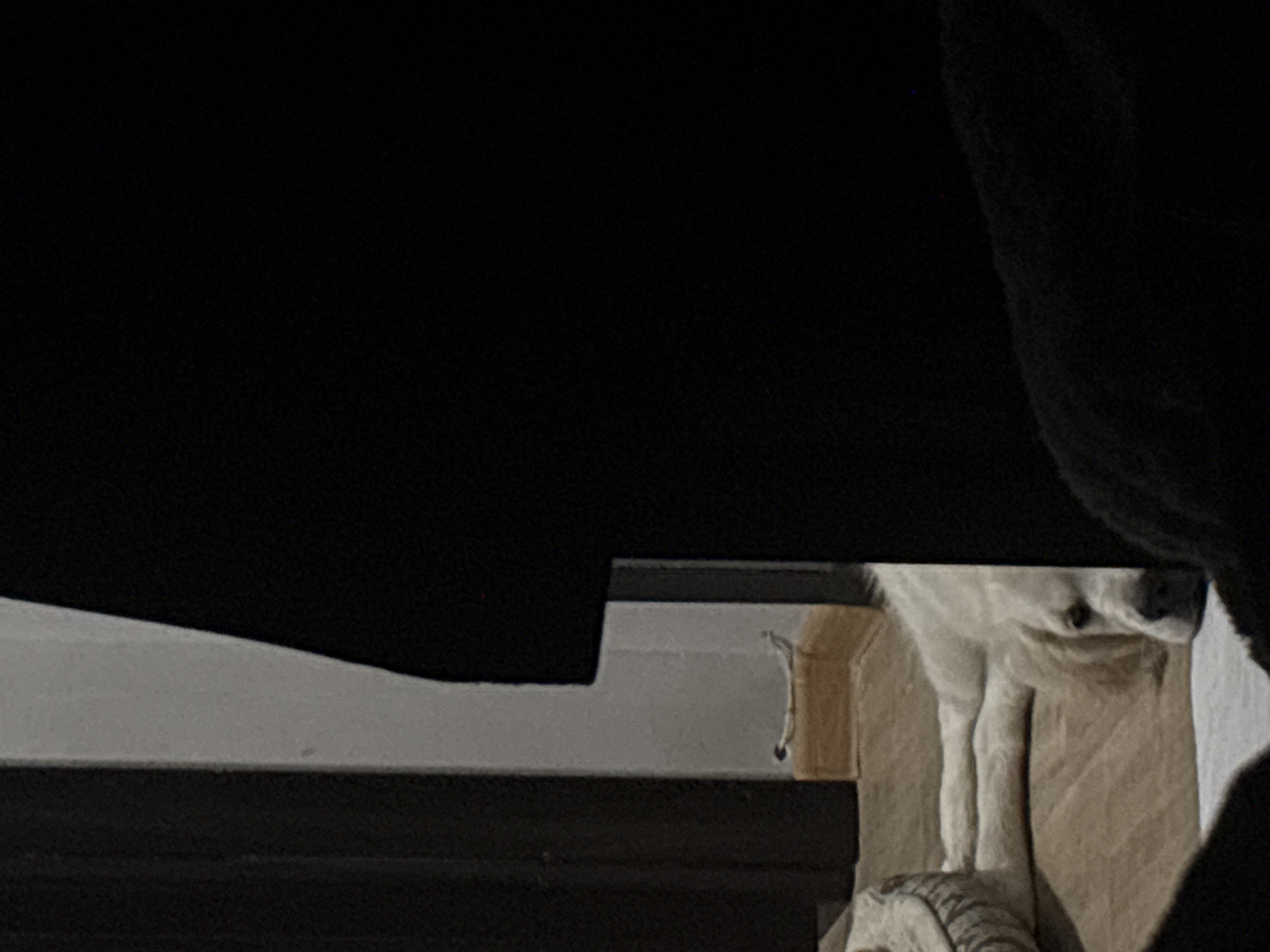 A partial view of a white dog's head and forelegs are visible peeking over the edge of what appears to be a bed or couch