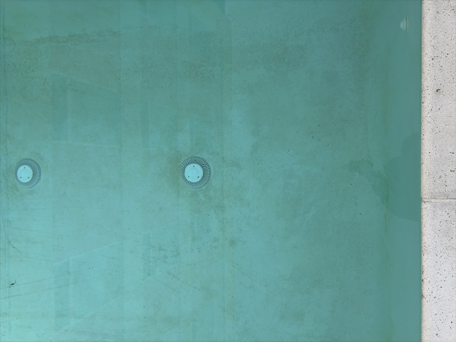 The image displays a top-down view of a swimming pool located in Hayward, United States of America. The pool is partially filled with still, murky greenish-blue water, revealing the concrete bottom. The bottom surface exhibits areas of discoloration, staining, and subtle horizontal bands, possibly indicating steps or depth markers. Two circular pool drains or returns are embedded in the pool floor: one is positioned in the upper-left quadrant, and the other is in the middle-right quadrant. Each drain features a white central cap surrounded by a grey, ribbed circular grate. The bottom portion of the image shows a light grey, coarse-textured concrete coping stone, appearing as two distinct blocks, which defines the immediate edge of the pool. Faint, dark, amorphous reflections or shadows are visible on the water's surface near the coping. No individuals, specific actions, or further environmental details are present. The scene is illuminated by ambient light.